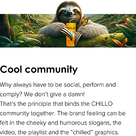 On the institutional website, the focus is on the product: CHILLO, the original cannabis iced tea. Here, iced tea drinkers can find all the information about the ingredients, production and mission of CHILLO.